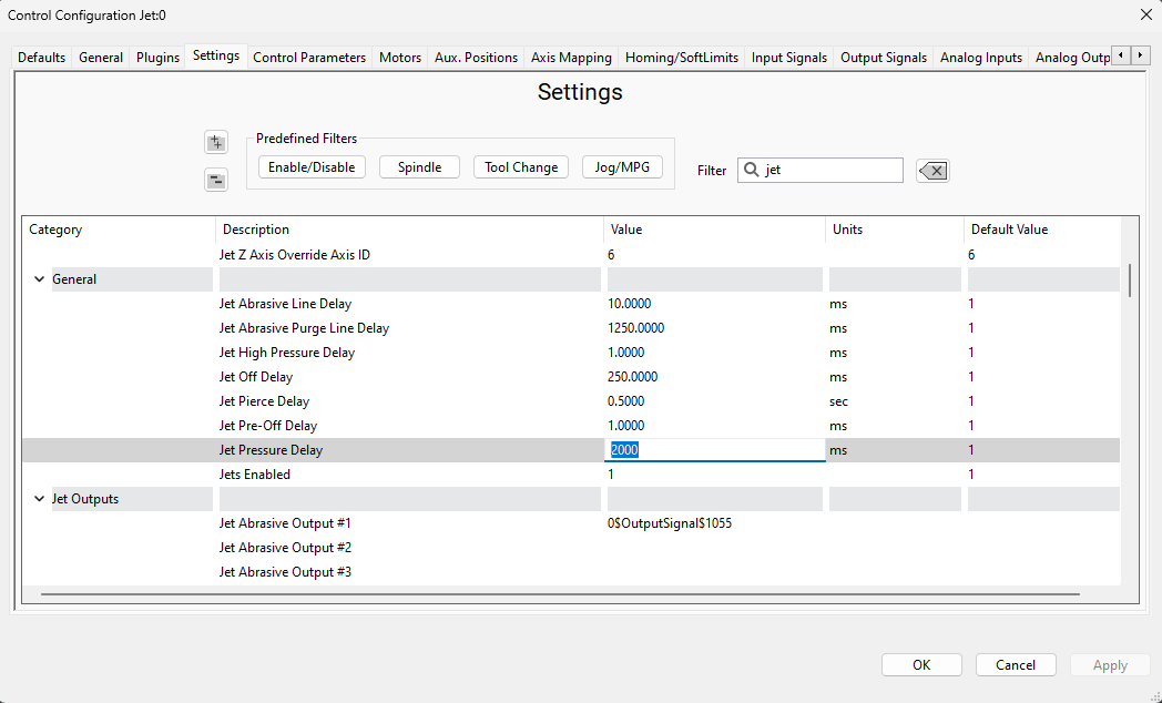 Then he was able to adjust the delay between the Jet Pressure output and the Abrasive output in the settings dialog.